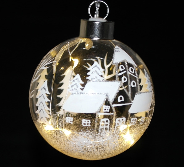 Julekule med hyttemotiv og LEDlys